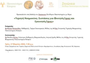 Πανεπιστήμιο Κύπρου27ος Κύκλος ΔιαλέξεωνΖηνώνειο – Ελεύθερο Πανεπιστήμιο στη Λάρνακα Προσκαλείστε στη διάλεξη του Ζηνώνειου Ελεύθερου Πανεπιστημίου με θέμα: «Τεχνητή Νοημοσύνη: Συστάσεις