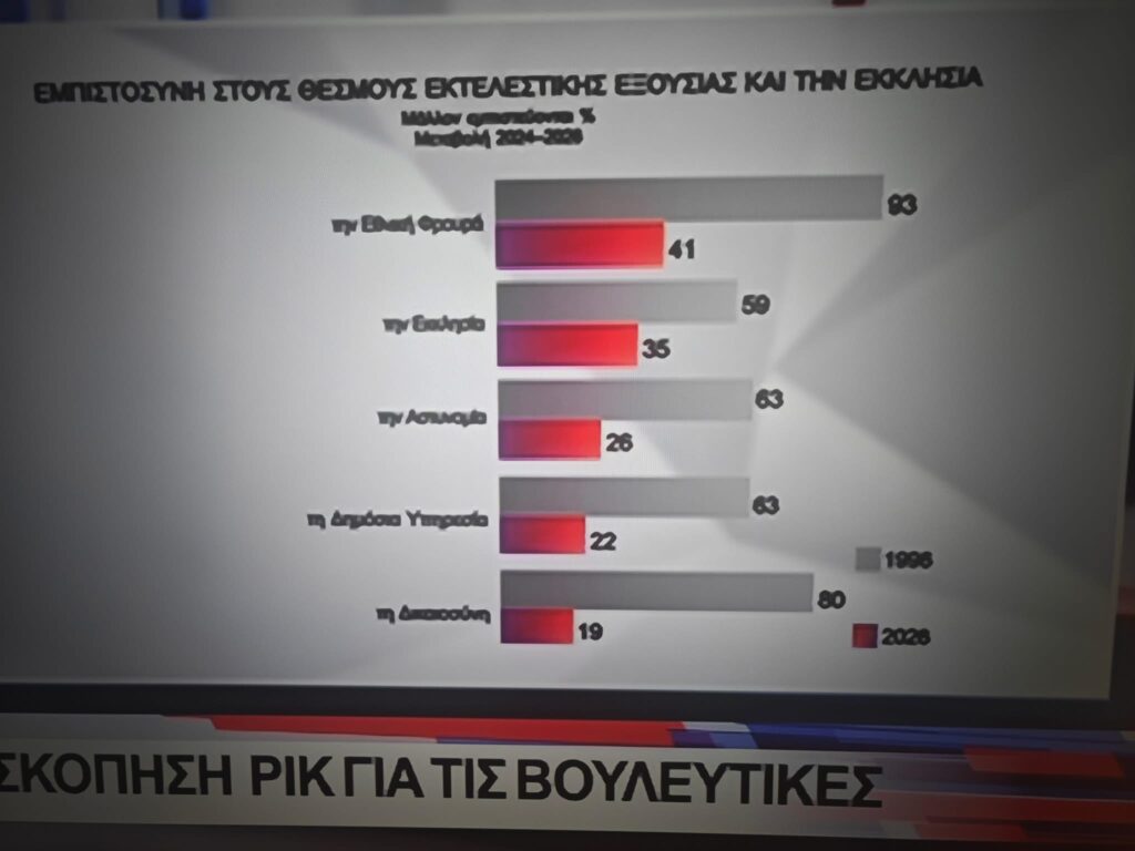 Η τόσο μεγάλη πτώση (80% σε 19%) δείχνει ότι για μεγάλο μέρος της κοινωνίας η δικαιοσύνη δεν θεωρείται πλέον ένας θεσμός που λειτουργεί αποτελεσματικά ή αξιόπιστα.