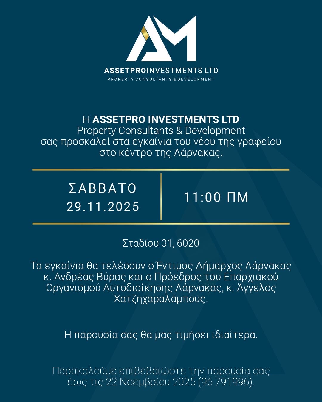 Text Follows in EnglishТекст следует на русском языке ΔΕΛΤΙΟ ΤΥΠΟΥ Η Assetpro Investments LTD – Property Consultants & Development, με χαρά ανακοινώνει τα εγκαίνια του νέου της γραφείου στο κέντρο της Λάρνακας. Η εκδήλωση θα πραγματοποιηθεί το Σάββατο, 29 Νοεμβρίου 2025, στις 11:00 π.μ.. Τα εγκαίνια θα τελεσουν ο Δήμαρχος Λάρνακας, κ. Ανδρέας Βύρας, και … Read more Εγκαίνια στο κέντρο της Λάρνακας για την Assetpro Investments LTD