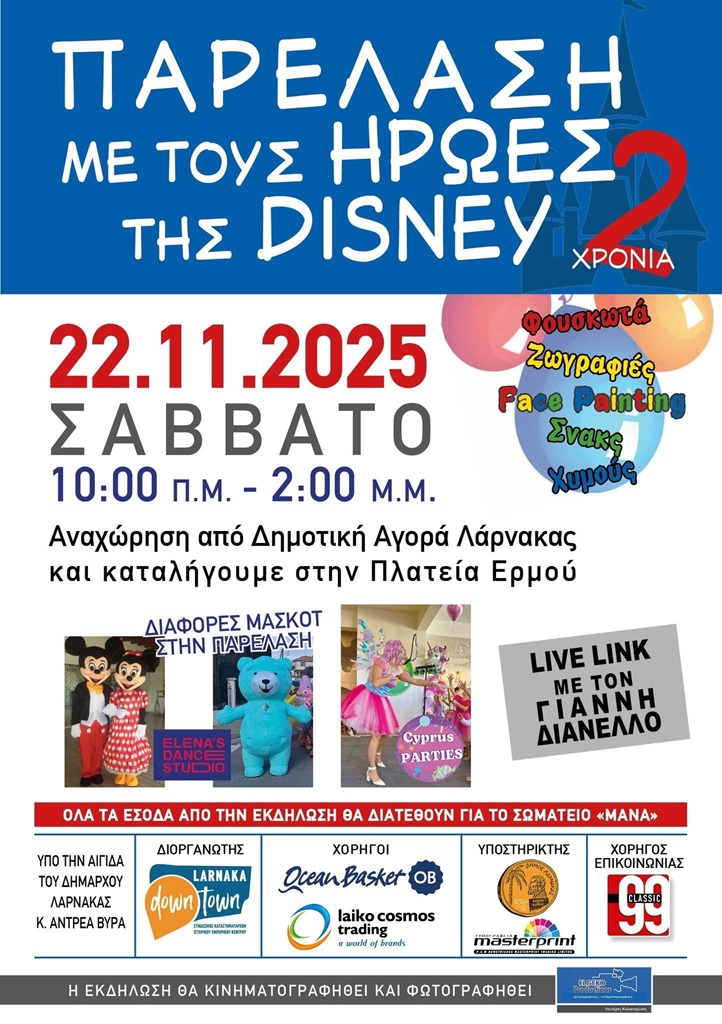 Text Follows in EnglishТекст следует на русском языке Η Λάρνακα ετοιμάζεται να ζήσει μια από τις πιο μαγικές και χαρούμενες ημέρες της! Οι αγαπημένοι ήρωες της Disney κατεβαίνουν στους δρόμους της πόλης και υπόσχονται να γεμίσουν το ιστορικό κέντρο με μουσική, χρώματα, γέλιο και… πολλή μαγεία. Το κέντρο ζωντανεύει, γεμίζει κίνηση, ενθουσιασμό και παιδικές φωνές … Read more Το κέντρο της Λάρνακας «φοράει» τα γιορτινά του και μετατρέπεται σε μια μεγάλη παιδική χαρά!