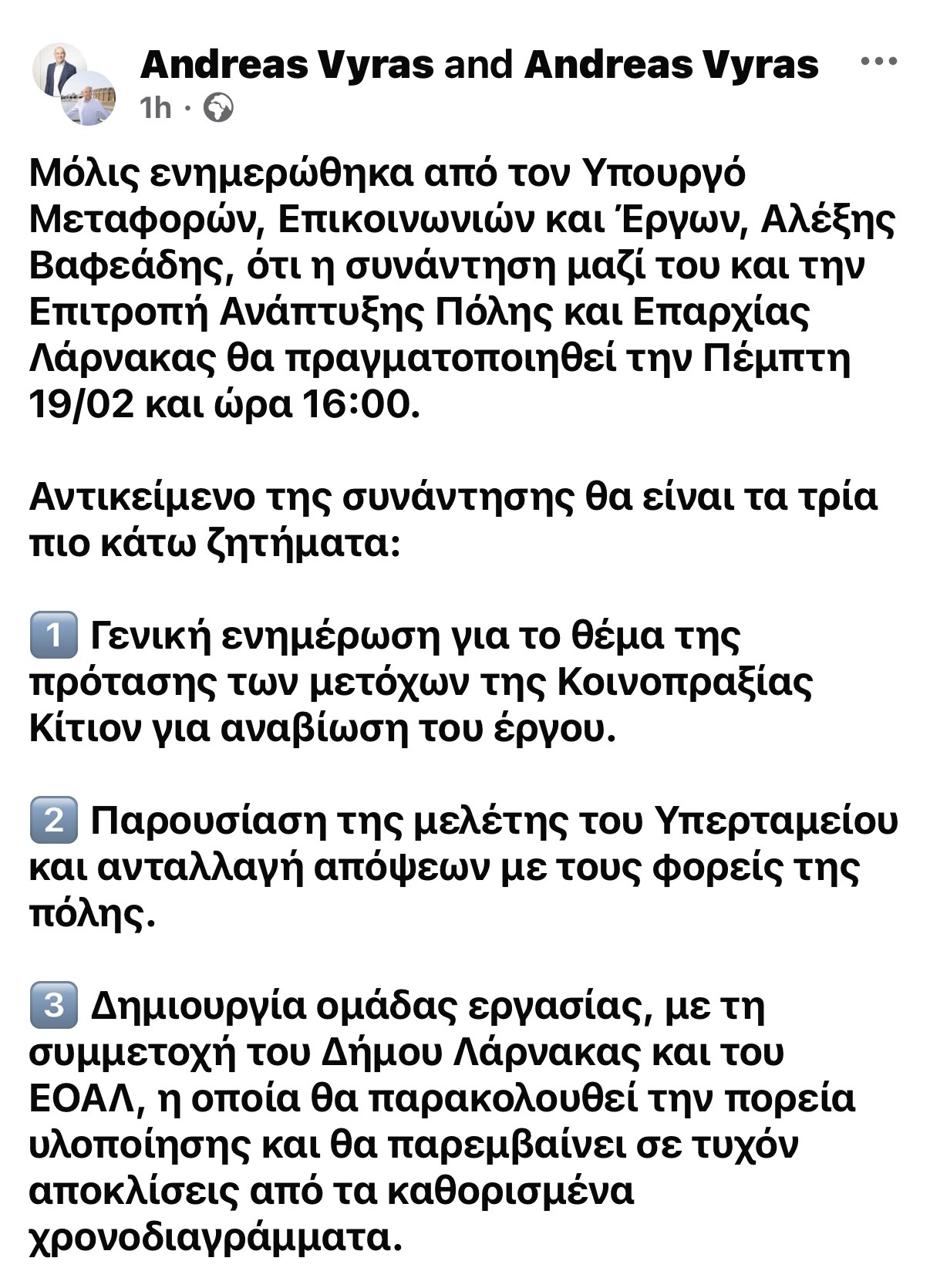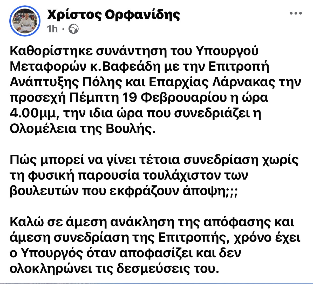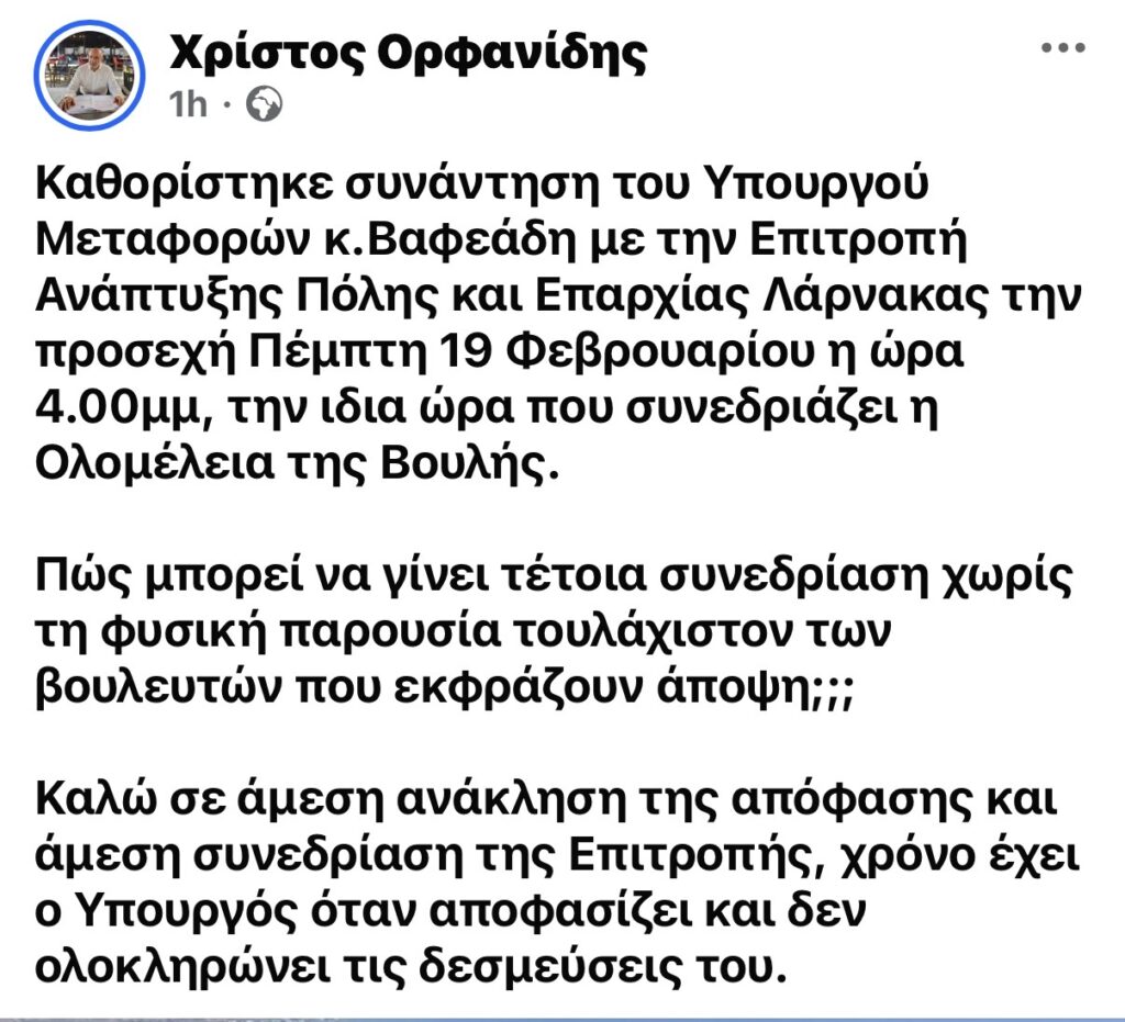 Μετά από δημόσια ανάρτηση του βουλευτή Χρίστου Ορφανίδη σχετικά με την ανάκληση της απόφασης για συνεδρίαση της Επιτροπής Ανάπτυξης του Δήμου Λάρνακα, (εδώ) η οποία είχε αρχικά οριστεί για την Πέμπτη 19 Φεβρουαρίου με τη συμμετοχή του Υπουργού Μεταφορών Αλέξη Βαφεάδη και αφορούσε το κρίσιμο ζήτημα μαρίνας – λιμανιού, προέκυψαν νέες εξελίξεις.