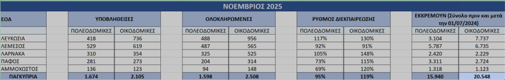 Despite the increased number of new applications submitted during the reference month, the Larnaca District Organisation not only fully responded to the workload but also exceeded the number of submissions, completing 325 town planning applications and 525 building permit applications.