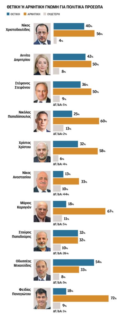 Ο πρόεδρος Νίκος Χριστοδουλίδης απολαμβάνει σήμερα 56% αρνητικής και 40% θετικής δημοτικότητας. Έχει θετικό ισοζύγιο στους ψηφοφόρους του ΔΗΚΟ (69%) και της ΔΗΠΑ (63%). Στους ψηφοφόρους του ΕΛΑΜ ουδέτερο (44% θετική, 47% αρνητική) και αρνητικό σε αυτούς του ΔΗΣΥ (42% θετική, 49% αρνητική). Αρνητικό εμφανίζεται πλέον το ισοζύγιο δημοτικότητας της προέδρου της Βουλής και του ΔΗΣΥ Αννίτας Δημητρίου, με 50% αρνητικές γνώμες και 42% θετικές. Ανάμεσα στους ψηφοφόρους του Δημοκρατικού Συναγερμού η κα Δημητρίου καταγράφει 57% θετική και 36% αρνητική γνώμη.
