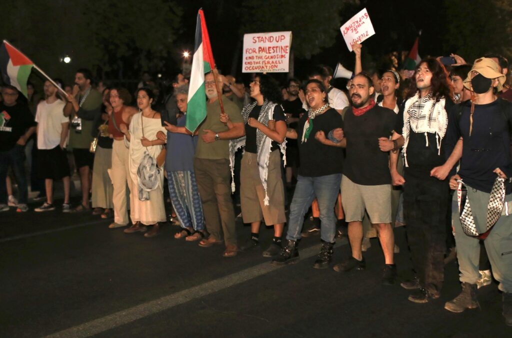 Πρόσθεσε ότι η διαμαρτυρία στρέφεται και «κατά της κυπριακής Κυβέρνησης για τη μη συμμόρφωση με τη γνωμοδότηση του Διεθνούς Δικαστηρίου της Χάγης, σύμφωνα με την οποία όλα τα κράτη οφείλουν να κάνουν ό,τι περνάει από το χέρι τους για να αποτρέψουν το Ισραήλ από το να διαπράξει γενοκτονία».