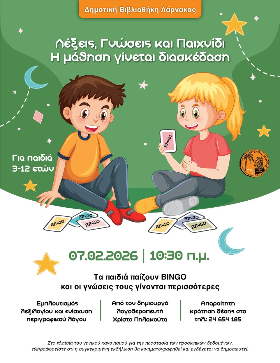 Text follows in English Η Δημοτική Βιβλιοθήκη Λάρνακας συνεχίζει να επενδύει στη δημιουργική μάθηση και στην ποιοτική ψυχαγωγία των παιδιών, διοργανώνοντας μια ξεχωριστή εκπαιδευτική δράση με τίτλο «Λέξεις, Γνώσεις και Παιχνίδι – Η μάθηση γίνεται διασκέδαση», η οποία απευθύνεται σε παιδιά ηλικίας 3 έως 12 ετών. Η εκδήλωση θα πραγματοποιηθεί το Σάββατο 7 Φεβρουαρίου 2026, … Read more Δημοτική Βιβλιοθήκη Λάρνακας: «Λέξεις, Γνώσεις και Παιχνίδι – Η μάθηση γίνεται διασκέδαση» με τον λογοθεραπευτής Χρίστος Πηλακούτας / Μια δράση που δεν πρέπει να χάσουν τα παιδιά