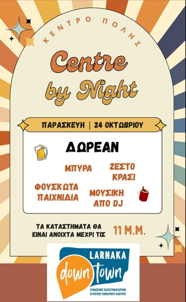 Την Παρασκευή 24 Οκτωβρίου, το κέντρο της Λάρνακας μεταμορφώνεται σε ένα τεράστιο υπαίθριο πάρτι, γεμάτο μουσική, χαμόγελα και θετική ενέργεια. Από τις 7 το απόγευμα μέχρι αργά τη νύχτα, οι δρόμοι της πόλης γεμίζουν ζωή, ρυθμό και αρώματα ζεστού κρασιού.