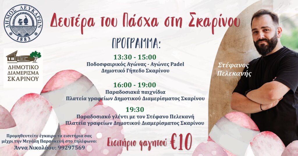 Η Δευτέρα του Πάσχα στη Σκαρίνου θα είναι γιορτή, συνάντηση και αναβίωση των πασχαλινών εθίμων με μπόλικη διασκέδαση αφού τη μουσική αναλαμβάνει ο πολύ αγαπημένος μας Στέφανος Πελεκανής.