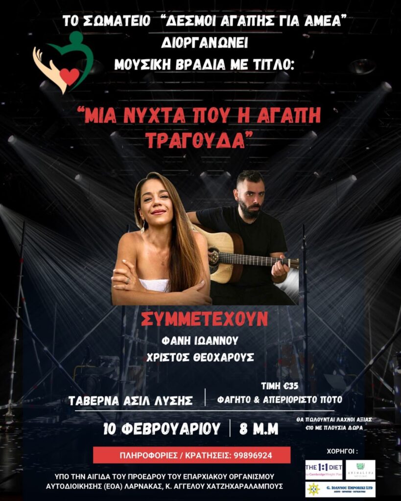 The Association “Desmoi Agapis for Persons with Disabilities” invites you to a magical musical evening filled with emotion and generosity. Join us for a night of entertainment in support of a worthy cause!
