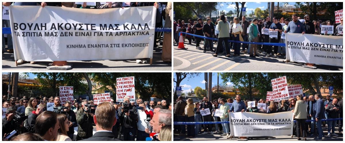Με πανό και πλακάτ μαζεύτηκαν έξω από τη Βουλή διάφορες οργανώσεις, ώστε να διαμαρτυρηθούν για τις προτεινόμενες αλλαγές, στο θέμα των εκποιήσεων.