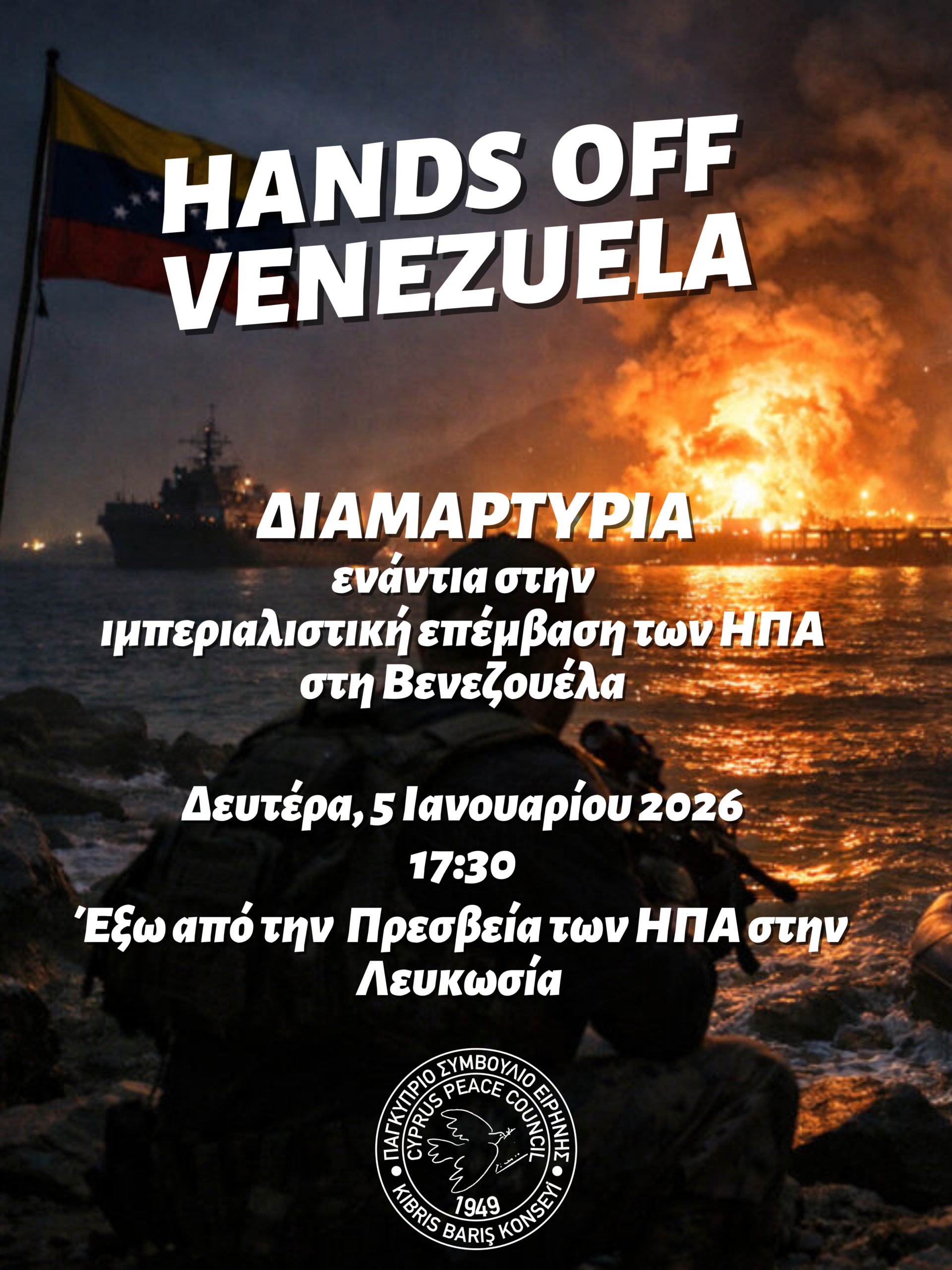 Finally, we call on everyone to take part in the protest organized by the Pancyprian Peace Council outside the U.S. Embassy in Nicosia on Monday, January 5th, at 17:30, to express our solidarity with the people of Venezuela.