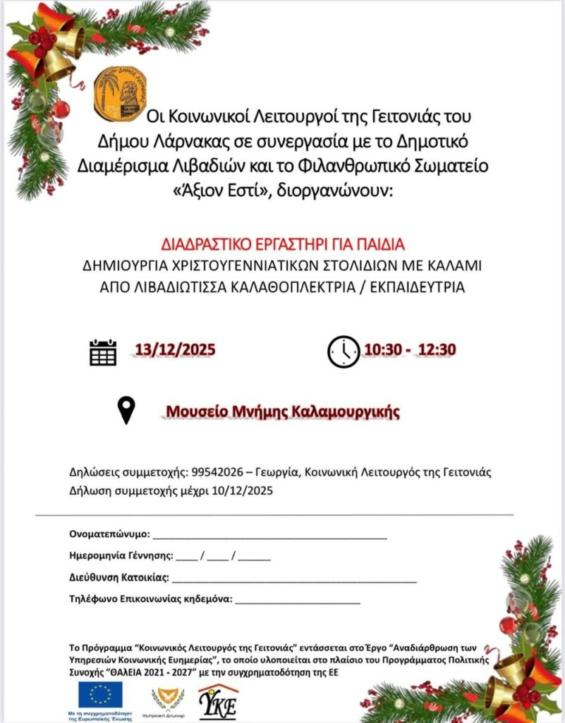 The Neighbourhood Social Workers of the Municipality of Larnaka, in collaboration with the Livadia Municipal District and the Charity Association “Axion Esti”, are organising an interactive workshop for children.