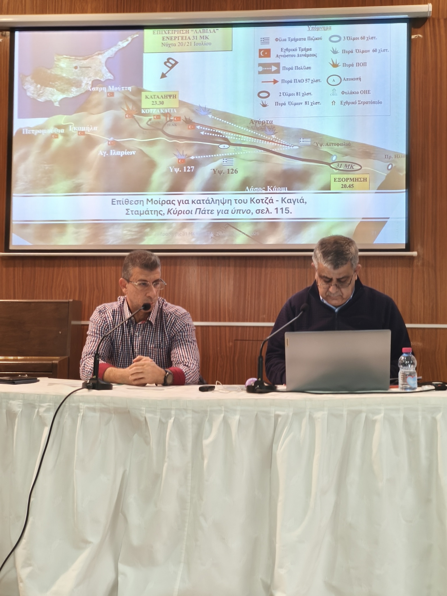 The lecture highlighted lesser-known historical aspects through testimonies of commandos and official written sources. Dr. Chrysostomou made a brief reference to the history of the Battalion, focusing mainly on its action during the critical period of 1974. The 31st Commando Battalion, headquartered in Athalassa at the Elias Papakyriakou Camp, departed from its base to take part in the events of 15 July 1974.