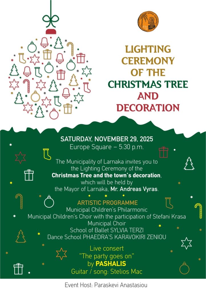 The heart of Larnaca is getting ready to shine and overflow with Christmas magic! The Municipality of Larnaca invites everyone, young and old, to this year’s impressive Christmas Tree and festive city lighting ceremony, which will be conducted by the Mayor of Larnaca, Mr. Andreas Vyras.