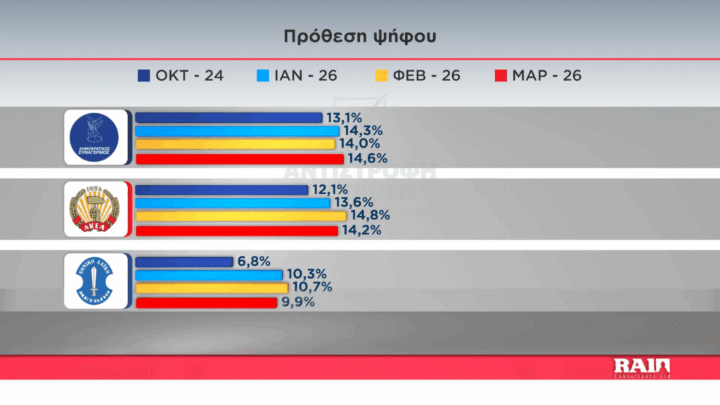 Αλλάζει η σκυτάλη στην πρώτη θέση, σύμφωνα με τις δημοσκοπήσεις του Άλφα, καθώς ο ΔΗΣΥ ξεπέρασε το ΑΚΕΛ, που προηγείτο στην προηγούμενη δημοσκόπηση, με ποσοστό της τάξεως του 14.6%, έναντι 14,2% του κόμματος της Αριστερας.
