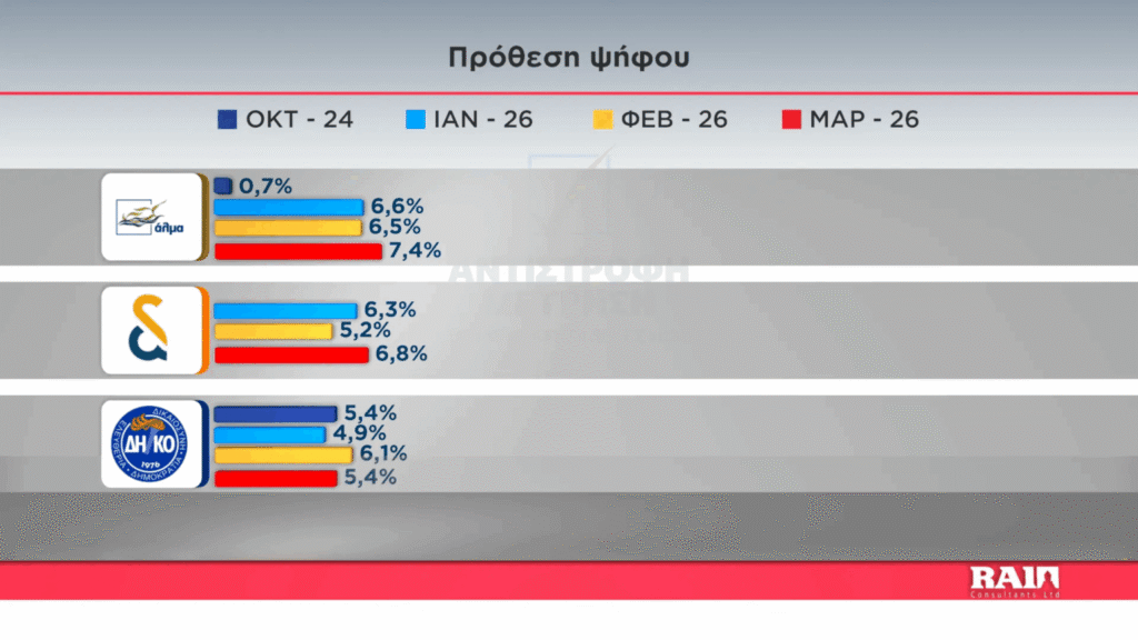 Το ΕΛΑΜ φαίνεται να παγιώνεται στην τρίτη θέση με ποσοστό 9,9%, σημειώνοντας ωστόσο μικρή πτώση σε σχέση με την δημοσκόπηση του Φεβρουαρίου, ενώ το Άλμα καλπάζει στην τέταρτη θέση με 6,8%.