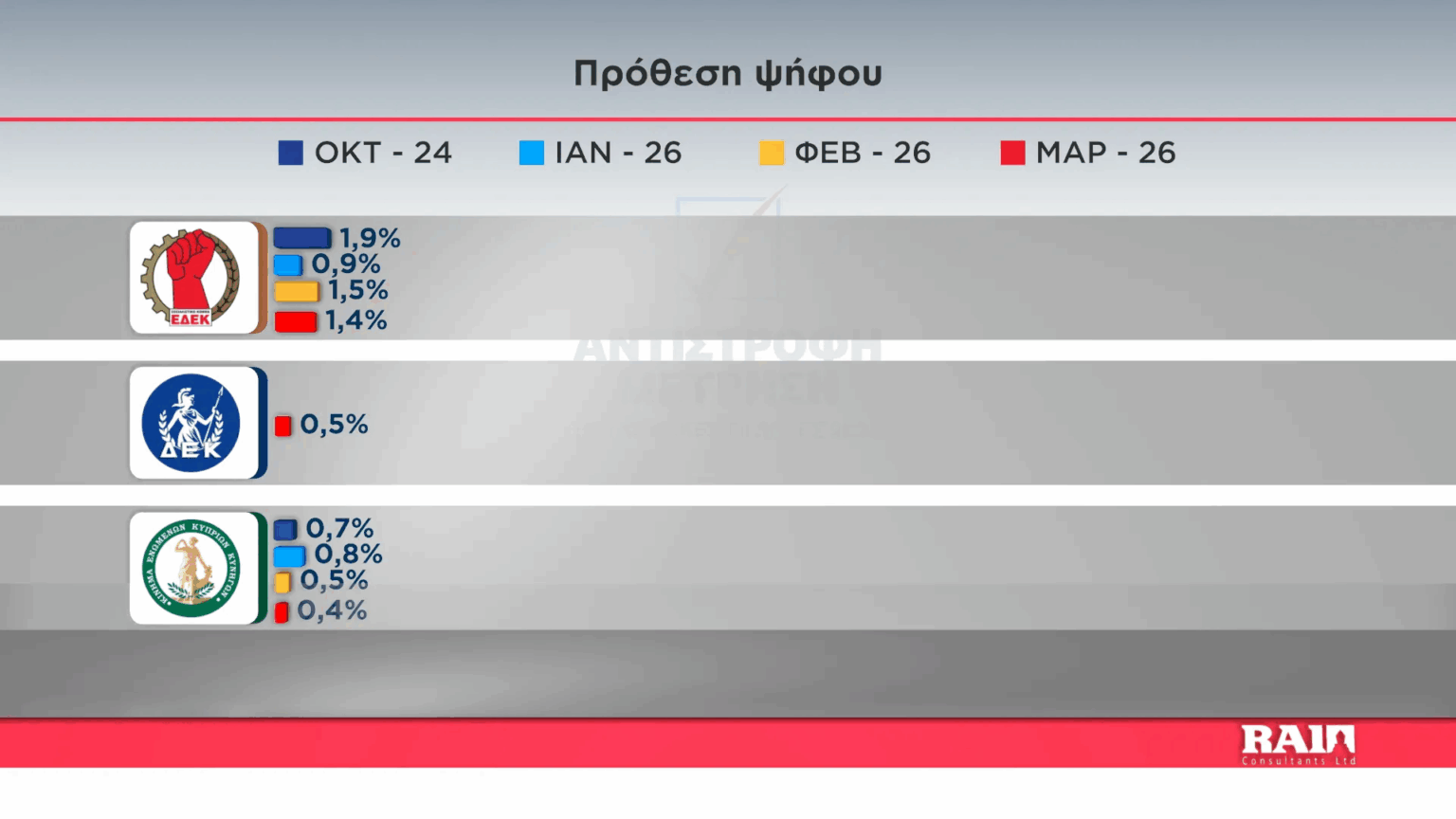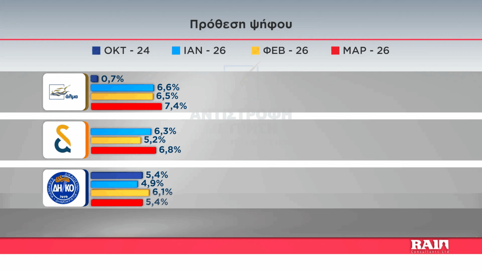 Διενεργήθηκε η τρίτη δημοσκόπηση του τηλεοπτικού σταθμού Alpha Κύπρου από την εταιρεία Rai Consultants η οποία μεταξύ άλλων παρουσιάζει την πρόθεση ψήφου των πολιτών, τις συσπειρώσεις των κομμάτων και το κατά πόσον οι πολίτες είναι ικανοποιημένοι με τους χειρισμούς της κυβέρνησης.