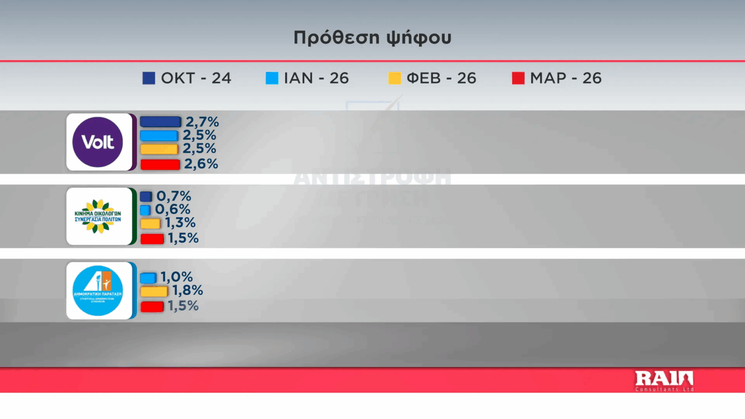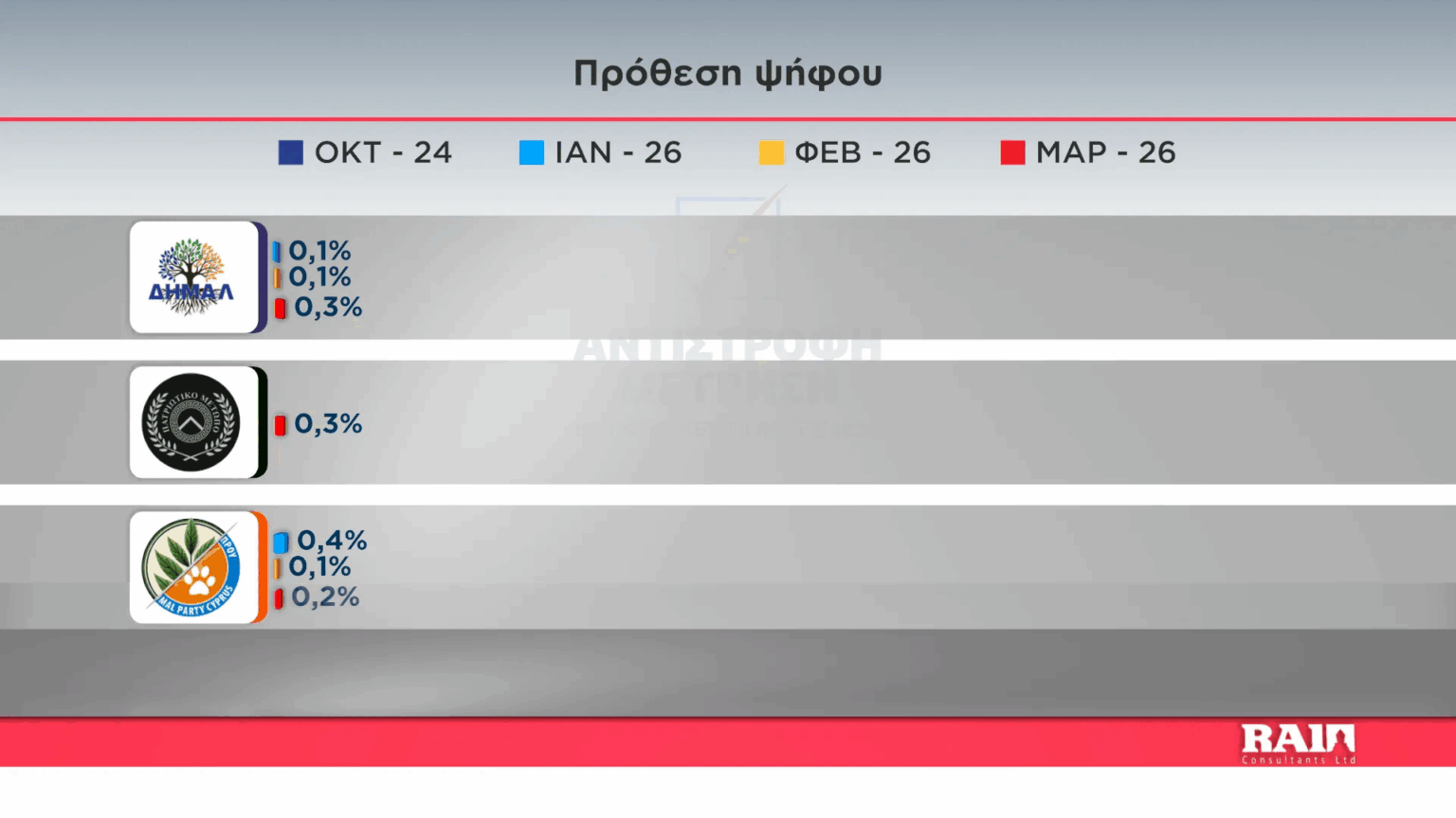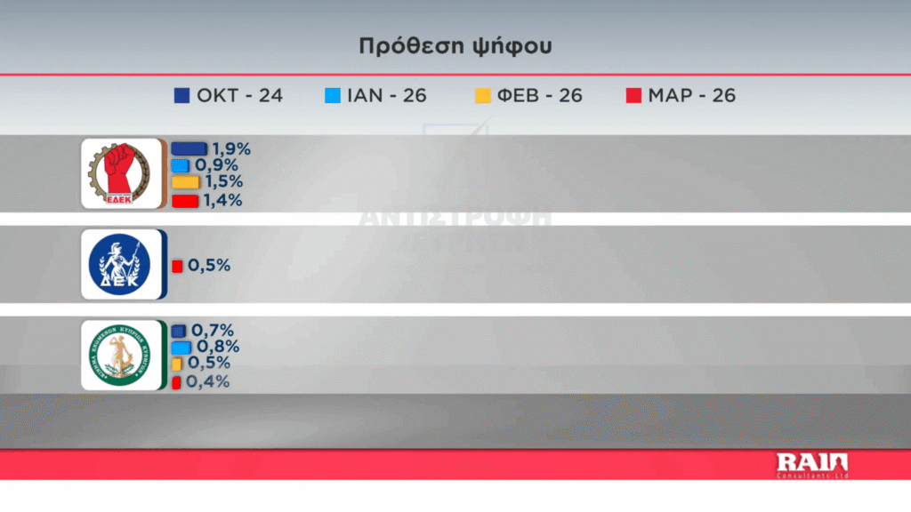 Τα υπόλοιπα κόμματα κινούνται σε ποσοστά μικρότερα του 3%, με το VOLT να είχε αυτό που έχει τις περισσότερες πιθανότητες για είσοδο στην βουλή, καθώς καταλαμβάνει ποσοστό της τάξεως του 2,7%. Υπενθυμίζουμε ότι ο εκλογικός πήχης στην Κύπρο για εξασφάλιση κοινοβουλευτικής έδρας είναι το 3,6%, επομένως με την αναγωγή επι των έγκυρων ψηφοδελτίων το εν λόγω κόμμα θα βρίσκεται στην βουλή των αντιπροσώπων.