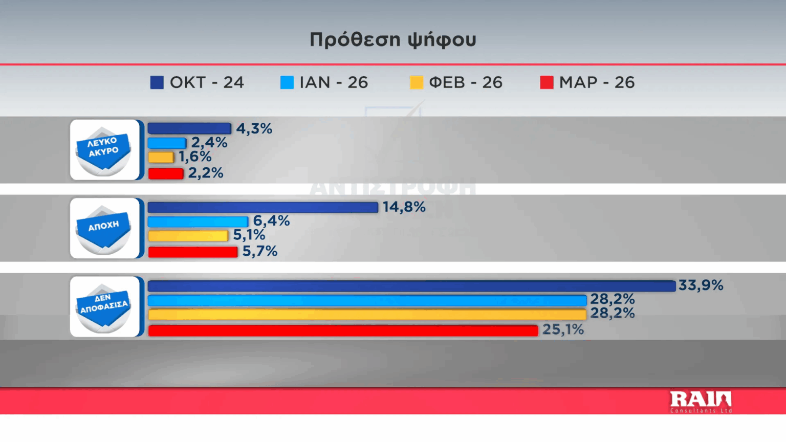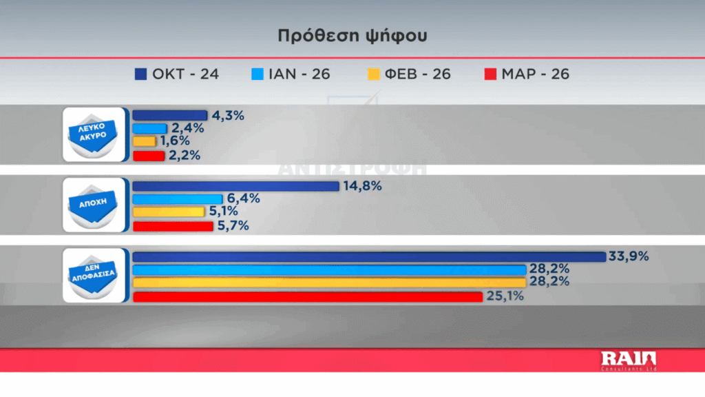 Αξίζει να σημειωθεί επίσης πως το 25% δήλωσε ότι δεν αποφάσισε ακόνη τι θα ψηφίσει γεγονός που αυξάνει σημαντικά τις πιθανότητες για ανατροπές την μέρα της κάλπης.