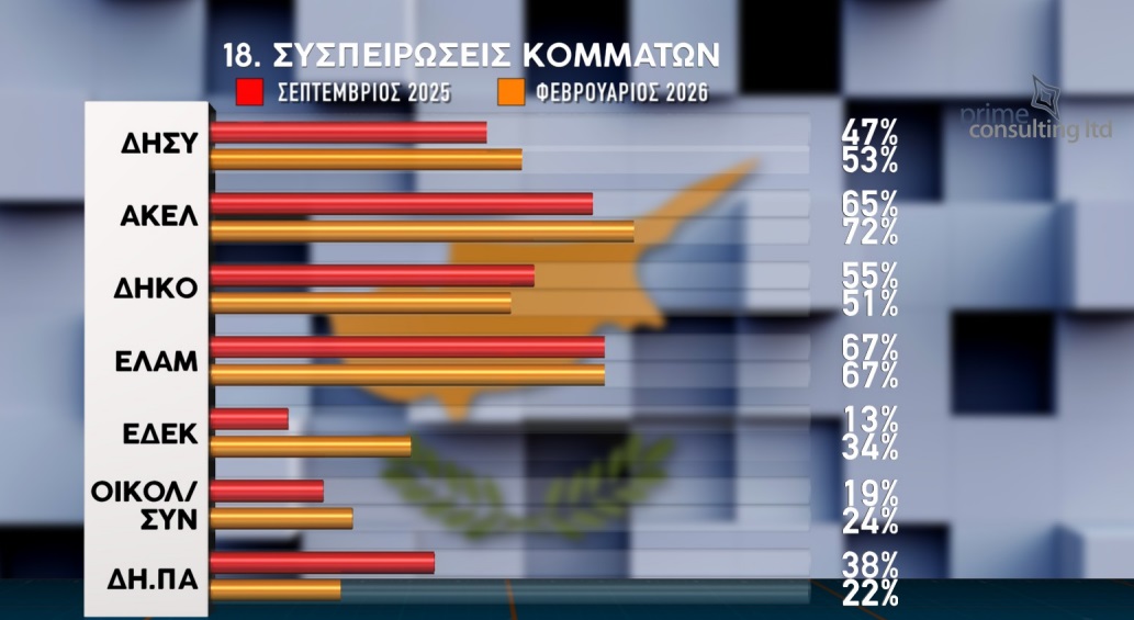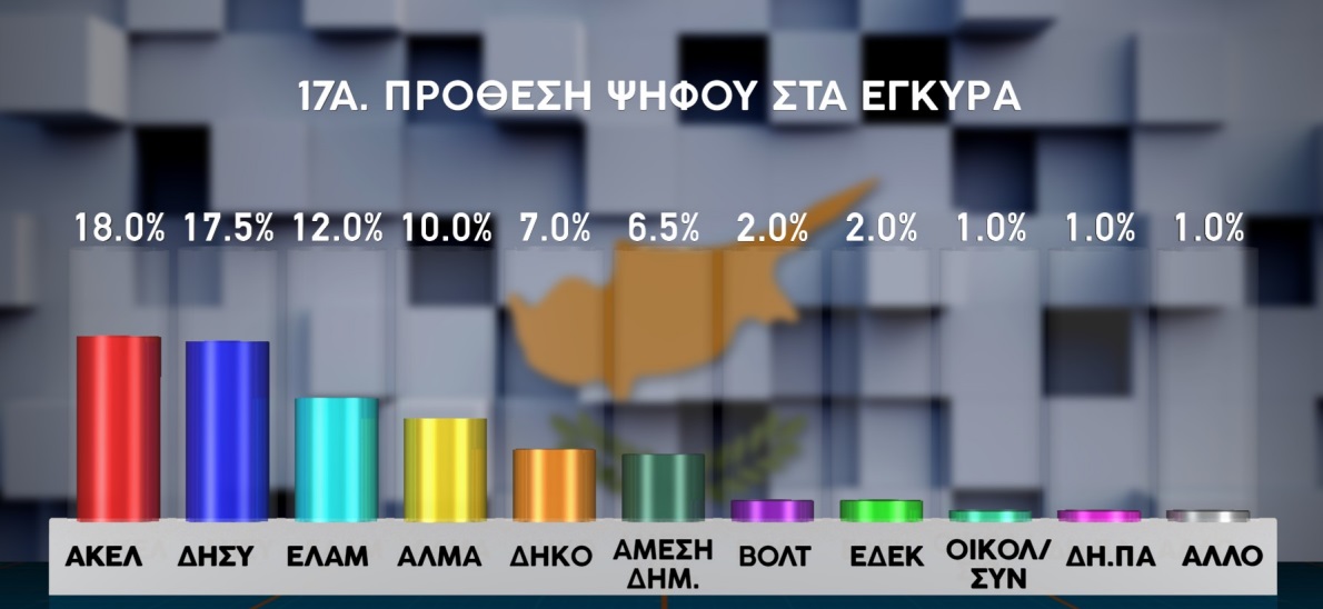 Πρώτο κόμμα με ποσοστό 18% κατατάσσεται το ΑΚΕΛ στη δημοσκόπηση που διενήργησε η Prime Consulting Ltd για λογαριασμό του τηλεοπτικού καναλιού ΣΙΓΜΑ, με τον ΔΗΣΥ στη δεύτερη θέση με ποσοστό 17,5%, το ΕΛΑΜ τρίτο με 12%, το ΑΛΜΑ τέταρτο με 10%, το ΔΗΚΟ πέμπτο με 7% και την Άμεση Δημοκρατία στην έκτη θέση με 6,5%. Το εκλογικό όριο του 3,6% για είσοδο στη Βουλή δεν ξεπερνούν τα κόμματα VOLT (2%), ΕΔΕΚ (2%), Κίνημα Οικολόγων-Συνεργασία Πολιτών (1%) και ΔΗΠΑ (1%). Αναποφάσιστο δήλωσε το 14,5% των συμμετεχόντων στην έρευνα γνώμης, ενώ 7,5% δεν έδωσε απάντηση στην ερώτηση για την πρόθεση ψήφου. Όλα τα πιο πάνω ποσοστά αφορούν την πρόθεση ψήφου στα έγκυρα, δηλαδή αφαιρώντας την αποχή που έφτασε στο 4%.