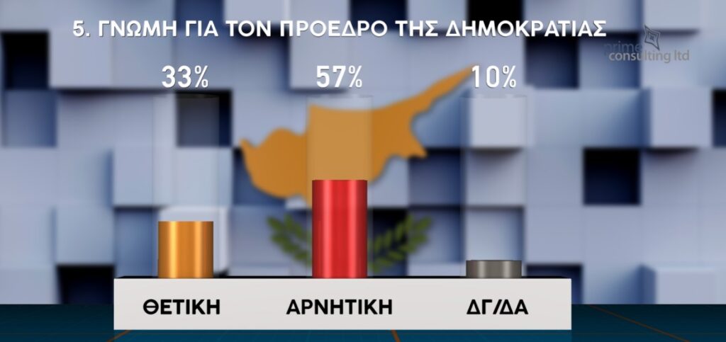 Αρνητική γνώμη για τον Πρόεδρο της Δημοκρατίας Νίκο Χριστοδουλίδη εξέφρασε το 57% των συμμετεχόντων στην έρευνα, ενώ θετική γνώμη δήλωσε το 33%. Επίσης, το 72% απάντησε «όχι και τόσο/καθόλου ικανοποιημένο» από το συνολικό έργο του Προέδρου της Δημοκρατίας, με το 27% να δηλώνει «πολύ/αρκετά» ικανοποιημένο.
