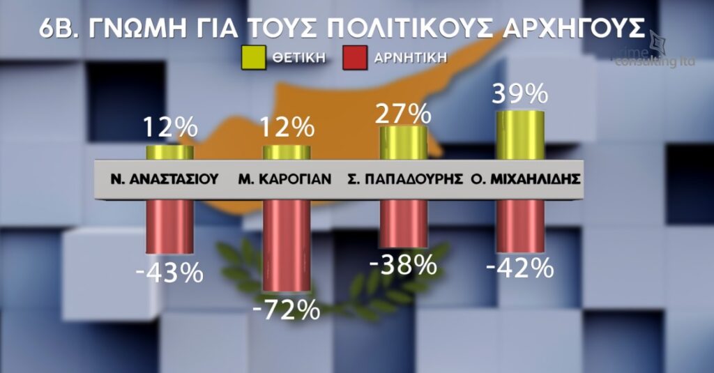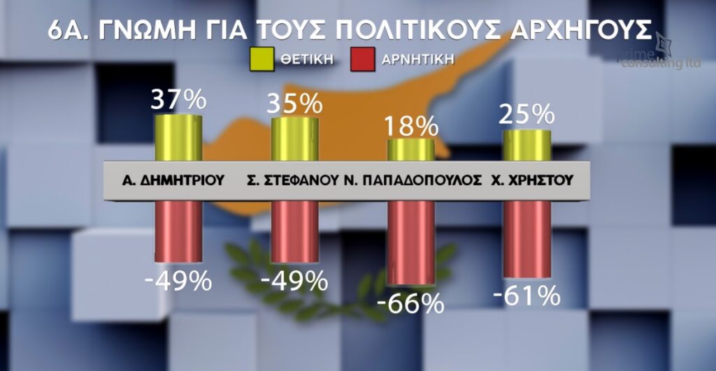 Πρώτος στα ποσοστά θετικής γνώμης για τους πολιτικούς αρχηγούς κατατάσσεται ο επικεφαλής του κόμματος ΑΛΜΑ Οδυσσέας Μιχαηλίδης με 39%. Στη δεύτερη θέση βρίσκεται η πρόεδρος του ΔΗΣΥ Αννίτα Δημητρίου με 37%, ακολουθεί ο γ.γ. του ΑΚΕΛ Στέφανος Στεφάνου με 35%, ο πρόεδρος του Κινήματος Οικολόγων – Συνεργασία Πολιτών Σταύρος Παπαδούρης με 27%, ο πρόεδρος του ΕΛΑΜ Χρίστος Χρίστου με 25% και ο πρόεδρος του ΔΗΚΟ Νικόλας Παπαδόπουλος με 18%. Στη έβδομη θέση κατατάσσεται ο ευρωβουλευτής Φειδίας Παναγιώτου με 17%, ενώ ο πρόεδρος της ΔΗΠΑ Μάριος Καρογιάν και ο πρόεδρος της ΕΔΕΚ Νίκος Αναστασίου λαμβάνουν από κοινού 12%. Η θετική γνώμη για τους συμπροέδρους του Volt Ανδρομάχη Σοφοκλέους και Πάνος Παρράς είναι 10% και 7% αντίστοιχα.