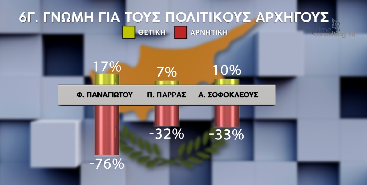 Πρώτος σε αρνητική γνώμη κατατάσσεται ο Φειδίας Παναγιώτου με 76%, ακολουθεί ο Μάριος Καρογιάν με 72%, ο Νικόλας Παπαδόπουλος με 66%, ο Χρίστος Χρίστου με 61%, η Αννίτα Δημητρίου και ο Στέφανος Στεφάνου που λαμβάνουν από κοινού 49% και ο Νίκος Αναστασίου με 43%. Η αρνητική γνώμη για τον Οδυσσέα Μιχαηλίδη αγγίζει το 42%, ακολουθεί ο Σταύρος Παπαδούρης με 38%, η Ανδρομάχη Σοφοκλέους με 33% και ο Πάνος Παρράς με 32%.