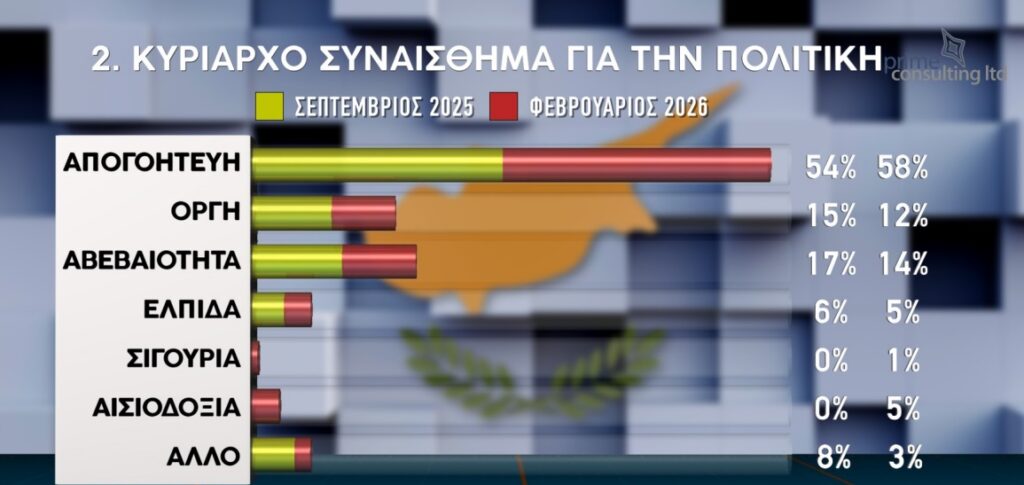 Η απογοήτευση αποτελεί το κυρίαρχο συναίσθημα για την πολιτική με ποσοστό 58%. Στη δεύτερη θέση με 14% είναι η αβεβαιότητα και στην τρίτη το αίσθημα της οργής με 12%.