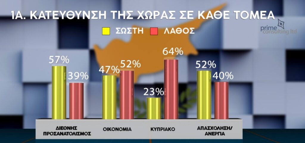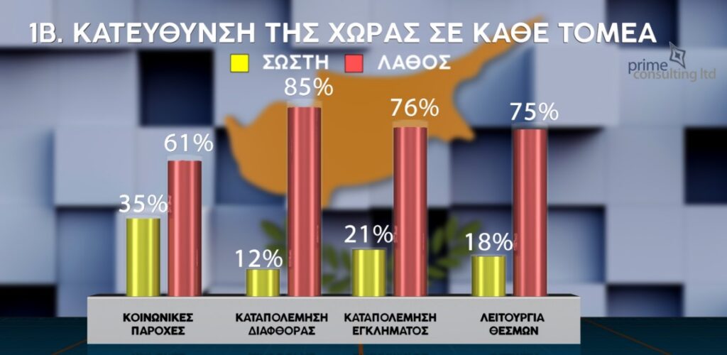 Στην ερώτηση για την κατεύθυνση της χώρας σε κάθε τομέα, οι συμμετέχοντες απαντούν ότι βρισκόμαστε σε λάθος κατεύθυνση ως προς την καταπολέμηση της διαφθοράς με ποσοστό που αγγίζει το 85%. Σε λάθος κατεύθυνση και ως προς την καταπολέμηση του εγκλήματος βρίσκεται η χώρα σύμφωνα με το 76%, ενώ λανθασμένη κρίνει τη λειτουργία των θεσμών το 75%. Το 64% δηλώνει ότι είναι σε λάθος κατεύθυνση η χώρα και στο θέμα του Κυπριακού. Μόνο ο διεθνής προσανατολισμός και η απασχόληση/ανεργία λαμβάνουν ψηλότερο ποσοστό θετικών απαντήσεων με 57% και 52% αντίστοιχα.