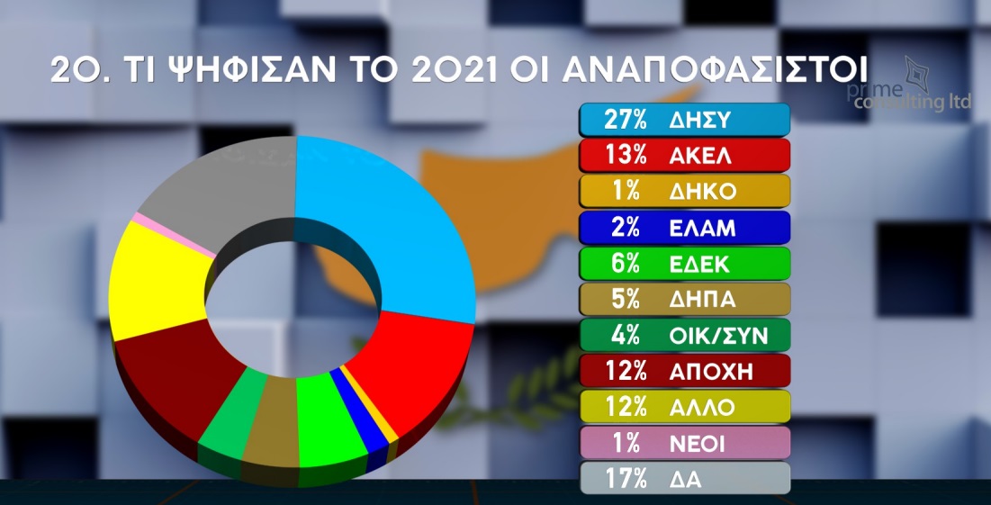Ενδιαφέρον παρουσιάζουν τα αποτελέσματα της έρευνας για το πώς ψήφισαν στις βουλευτικές εκλογές του 2021 όσοι δηλώνουν αναποφάσιστοι. Το 27% ψήφισε ΔΗΣΥ, το 13% ΑΚΕΛ, την ΕΔΕΚ το 6%, τη ΔΗΠΑ το 5%, το Κίνημα Οικολόγων το 4%, το ΕΛΑΜ το 2% και το ΔΗΚΟ το 1%.