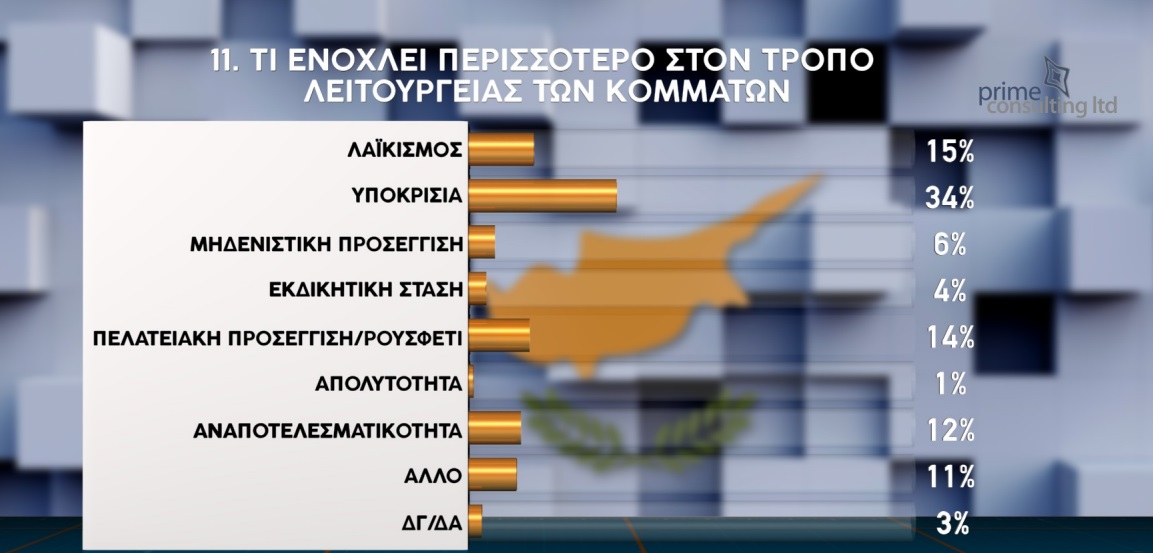Στην ερώτηση τι ενοχλεί περισσότερο στον τρόπο λειτουργίας των κομμάτων, το 34% αναφέρει την υποκρισία, το 15% τον λαϊκισμό και το 14% την πελατειακή σχέση/ρουσφέτι.