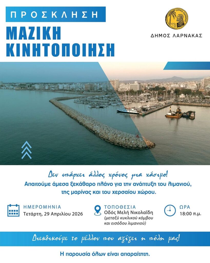 Ως Δημοτική Ομάδα, στηρίζουμε και συμμετέχουμε στη μεγάλη κινητοποίηση που διοργανώνεται την Τετάρτη 29/4 η ώρα 18:00 από τον Δήμο και την Επιτροπή Ανάπτυξης Πόλης και Επαρχίας Λάρνακας. Είναι η στιγμή να σταλεί ένα ξεκάθαρο μήνυμα: η πόλη δεν θα ανεχτεί άλλη κοροϊδία.