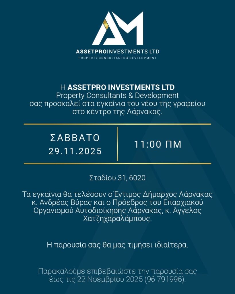 Η Assetpro Investments LTD – Property Consultants & Development, με χαρά ανακοινώνει τα εγκαίνια του νέου της γραφείου στο κέντρο της Λάρνακας.