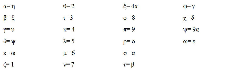 Oι Φιλικοί χρησιμοποιούσαν τα γνωστά γράμματα του αλφαβήτου αλλά με φωνητική αξία διαφορετική. Πιο αναλυτικά το κρυπτογραφικό αλφάβητο της Φιλικής Εταιρείας είχε ως εξής: