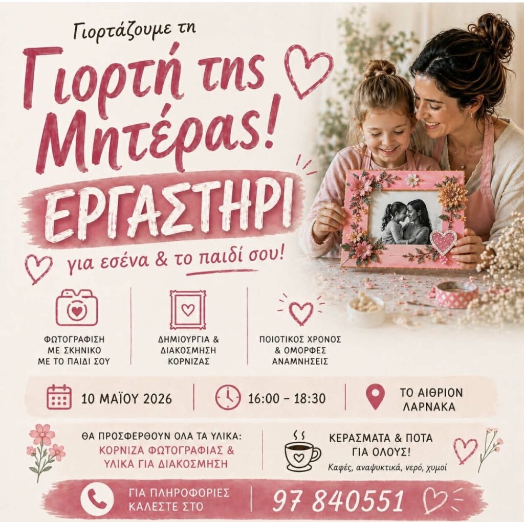Ένα ιδιαίτερο εργαστήρι στη Λάρνακα δίνει την ευκαιρία σε μητέρες και παιδιά να περάσουν ποιοτικό χρόνο μαζί, να φωτογραφηθούν σε ένα ζεστό, θεματικό σκηνικό και να δημιουργήσουν τη δική τους διακοσμημένη κορνίζα, κρατώντας ζωντανές τις πιο τρυφερές αναμνήσεις.