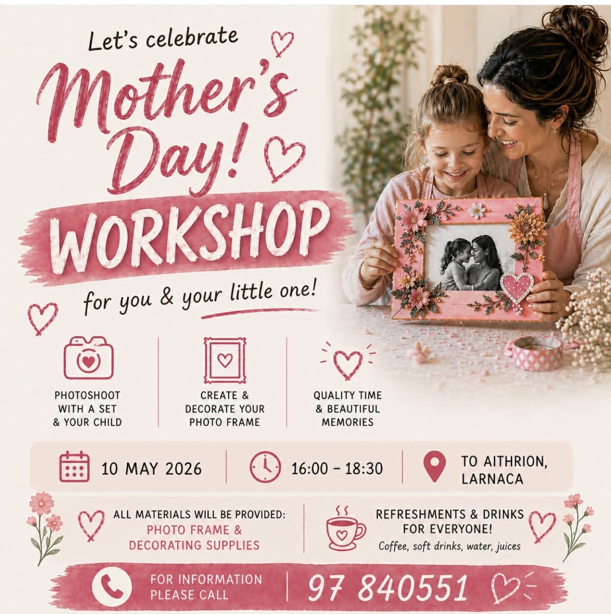 A unique workshop in Larnaca offers mothers and children the opportunity to spend quality time together, enjoy a themed photoshoot, and create their own beautifully decorated photo frame—capturing and preserving their most tender memories.
