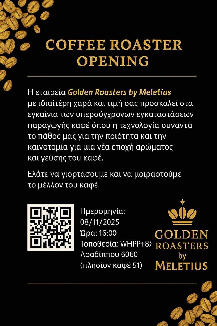 Μια νέα εποχή για τον ποιοτικό καφέ ξεκινά αυτό αύριο Σάββατο, 8 Νοεμβρίου, στην Αραδίππου, με τα εγκαίνια του Golden Roasters by Meletius. Ένας χώρος που συνδυάζει roasting lab, tasting area και retail σημείο, προσκαλεί τους λάτρεις του καφέ να γνωρίσουν από κοντά τη μαγεία του καβουρδίσματος και να απολαύσουν μοναδικές ποικιλίες από όλο τον κόσμο. Ο Μελέτιος και η ομάδα του μάς μιλούν για το πάθος, τη φιλοσοφία και το όραμα πίσω από ένα εγχείρημα που υπόσχεται να αλλάξει τα δεδομένα της κυπριακής σκηνής του καφέ.