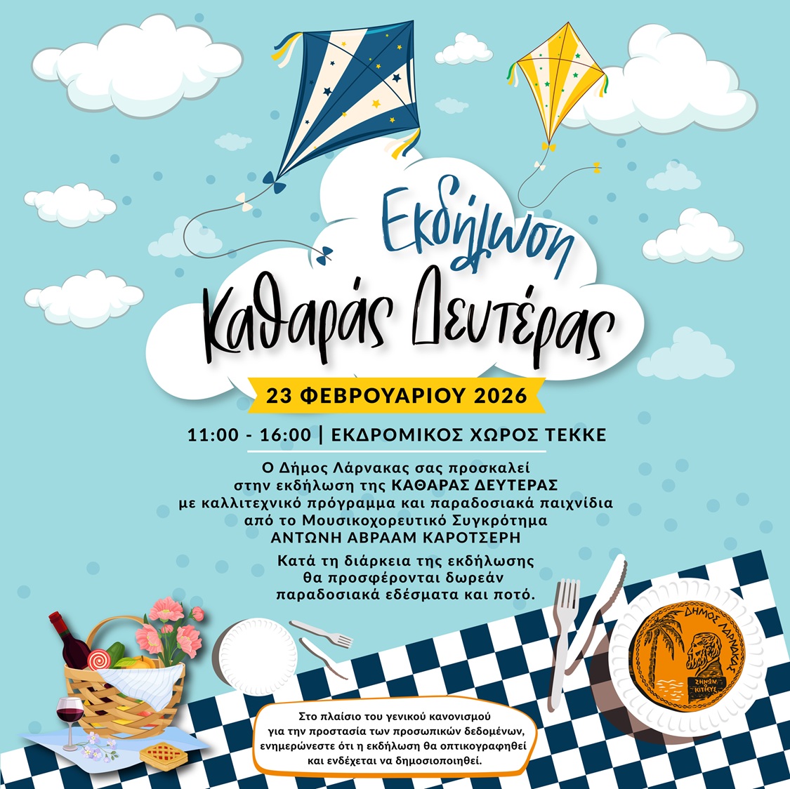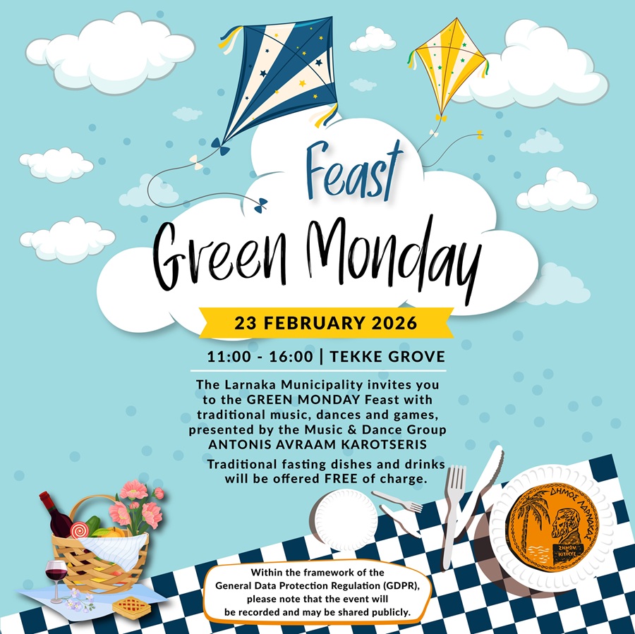 Η μεγάλη γιορτή συνεχίζεται στον εκδρομικό χώρο Τεκκέ! Ο Δήμος Λάρνακας θα προσφέρει δωρεάν παραδοσιακά εδέσματα, ενώ η ημέρα θα πλαισιωθεί με παραδοσιακή μουσική, τραγούδια, τσιαττιστά, χορούς, και παιγνίδια από το Μουσικοχορευτικό Συγκρότημα Αντώνη Αβραάμ Καροτσέρη αλλά και δραστηριότητες για παιδιά που θα κάνουν την ημέρα αξέχαστη.