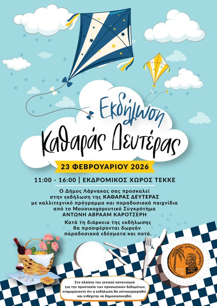 Ο Δήμος Λάρνακας όπως κάθε χρόνο εδώ και πολλά χρόνια, μας προσκαλεί όλους να γιορτάσουμε μαζί την Καθαρά Δευτέρα, στις 23 Φεβρουαρίου 2026, από τις 11:00 έως τις 16:00, στον Εκδρομικό Χώρο Τεκκέ.