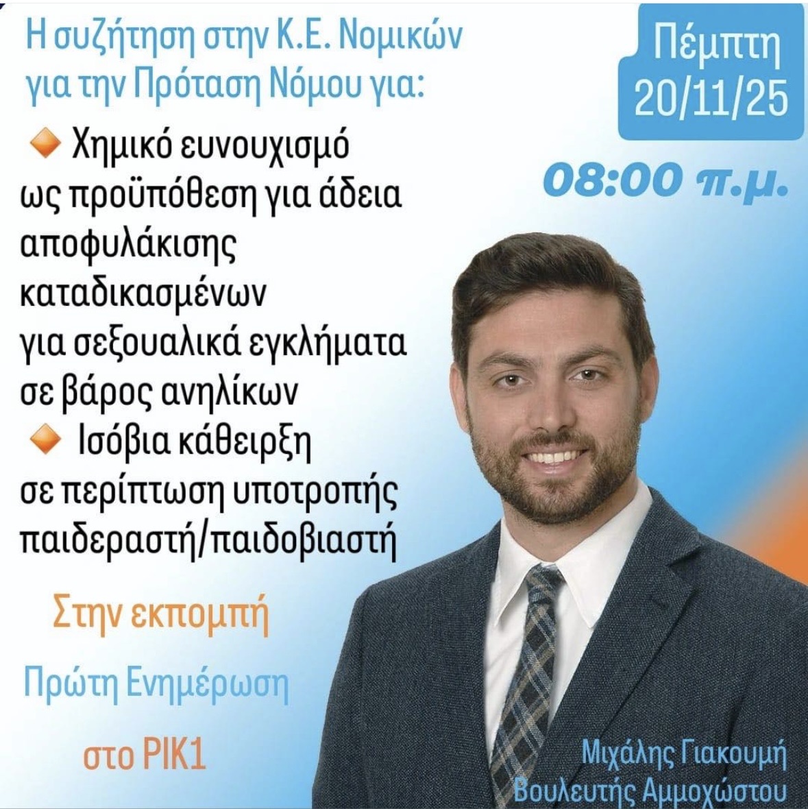 Stricter penalties must be imposed on these monsters. The discussion in Parliament (kudos to MP Michalis Yiakoumis) about chemical castration as a condition for parole for those convicted of sexual crimes against minors, as well as life imprisonment for recidivist child abusers, is a NECESSITY. Enough with lenient sentences.