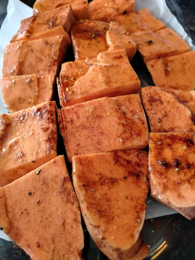 Line a baking tray with parchment paper and place the sweet potatoes on it.