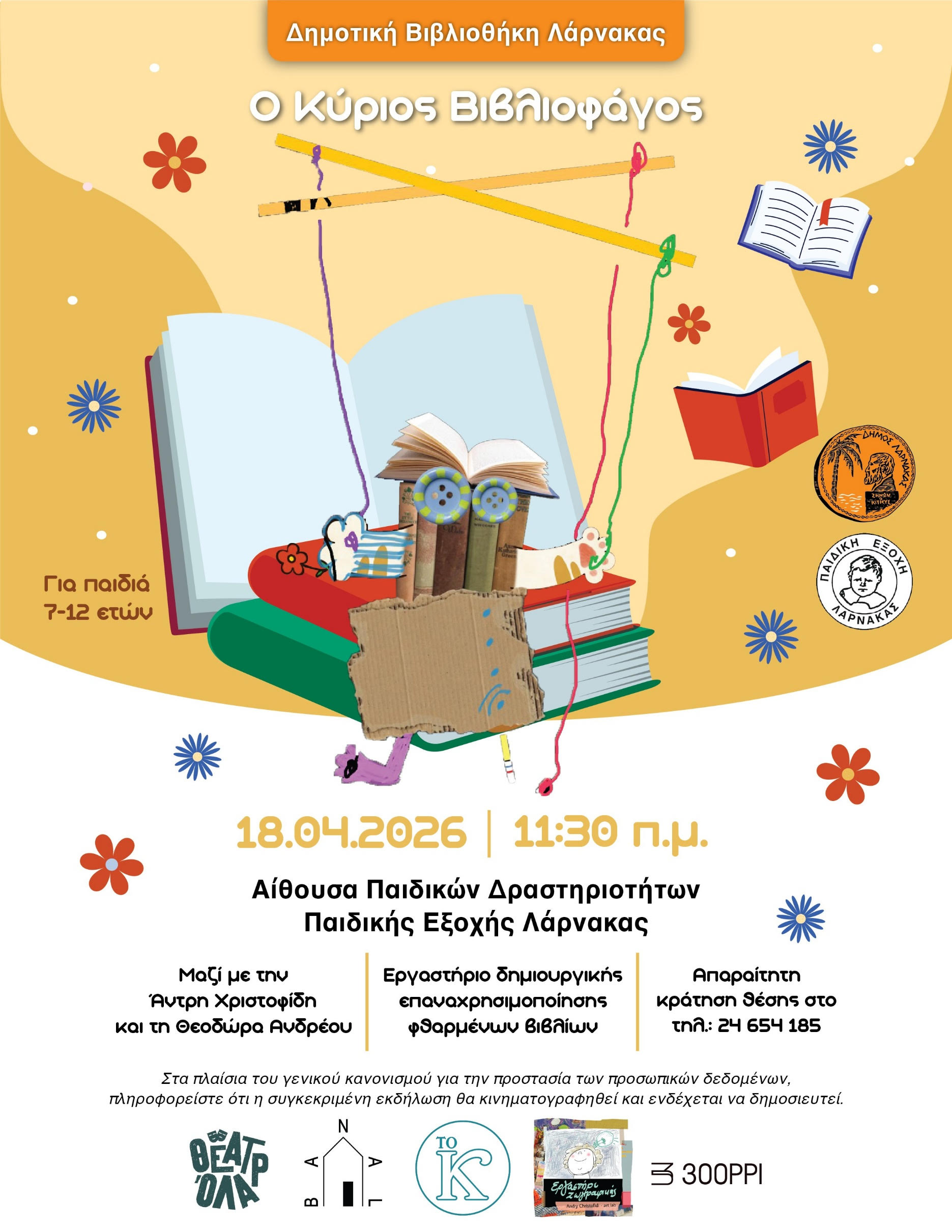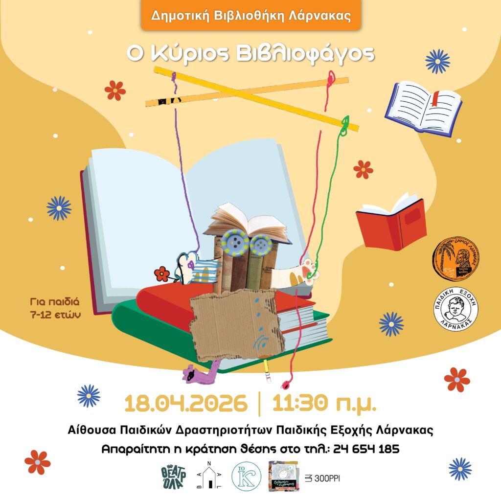 Η Δημοτική Βιβλιοθήκη Λάρνακας προσκαλεί τους μικρούς της φίλους σε μια ξεχωριστή δημιουργική δράση με τίτλο «Ο Κύριος Βιβλιοφάγος», ένα διαδραστικό και εμπνευσμένο εργαστήρι αφιερωμένο στη φαντασία και την αγάπη για το βιβλίο.