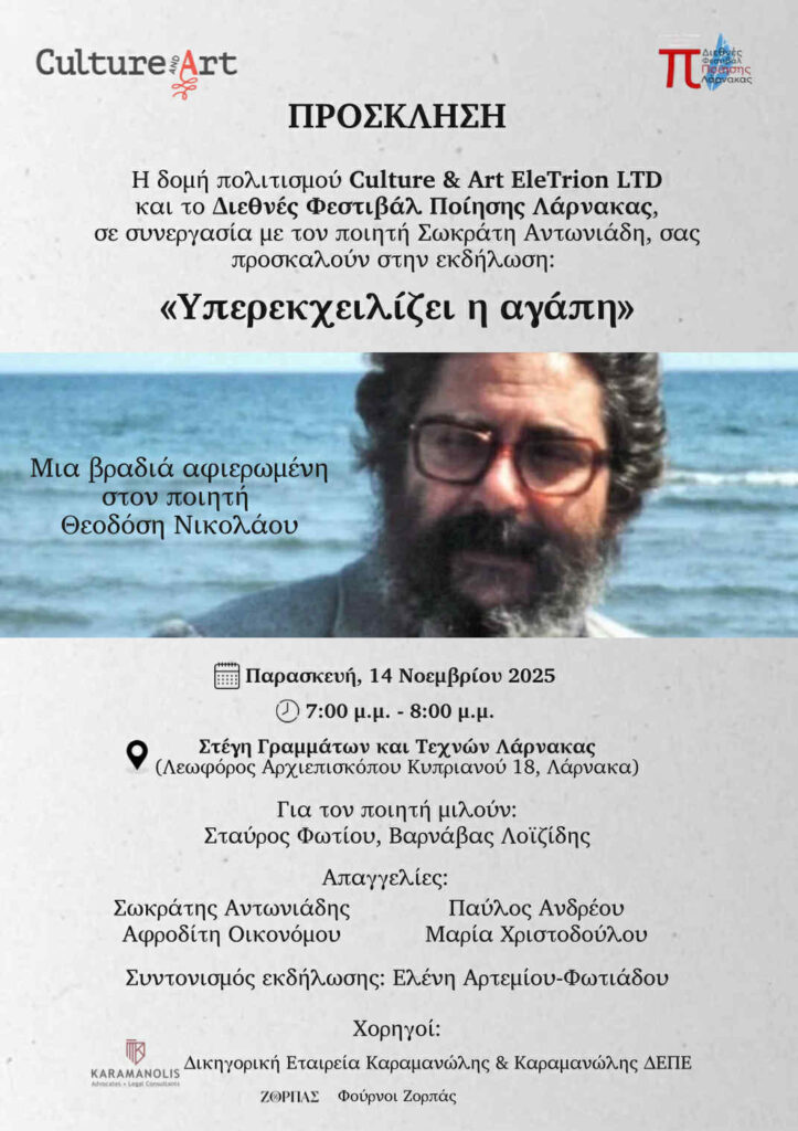 The cultural organization Culture & Art EleTrion LTD and the Larnaca International Poetry Festival, in collaboration with poet Socrates Antoniades, are organizing a special event dedicated to the memory and work of the beloved poet Theodosis Nicolaou, entitled “Love Overflows.”