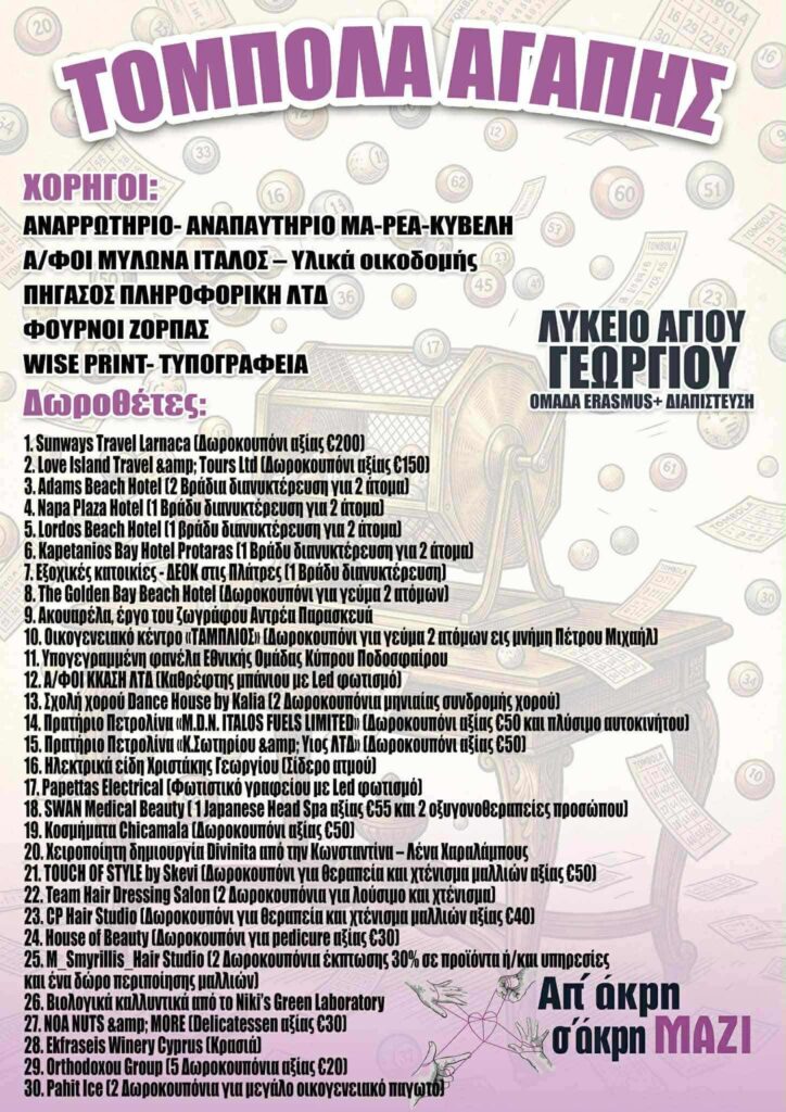 Η ομάδα του Προγράμματος Erasmus+ Διαπίστευση του Λυκείου Αγίου Γεωργίου Λάρνακας πραγματοποίησε με απόλυτη επιτυχία τη φιλανθρωπική εκδήλωση «Τόμπολα Αγάπης» στο πλαίσιο της πρωτοβουλίας «Απ’ Άκρη σ’ Άκρη, Μαζί».