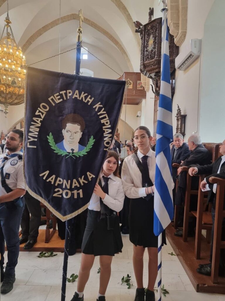 Το σχολειο του Γυμνασίου Πετράκη Κυπριανού στη Λάρνακα εκπροσωπήθηκε από την σημαιοφορο Ελένη Κουζαπά Γ3, την παραστάτη Δημητρίου Κυριακή Γ3 με την συνοδεία των καθηγητριών: Ανδρούλας Νικολάου ΒΔ, Λευκής Ζάκου Κιρκιλλή ΒΔ, Κλεοπάτρας Ιάσωνος.