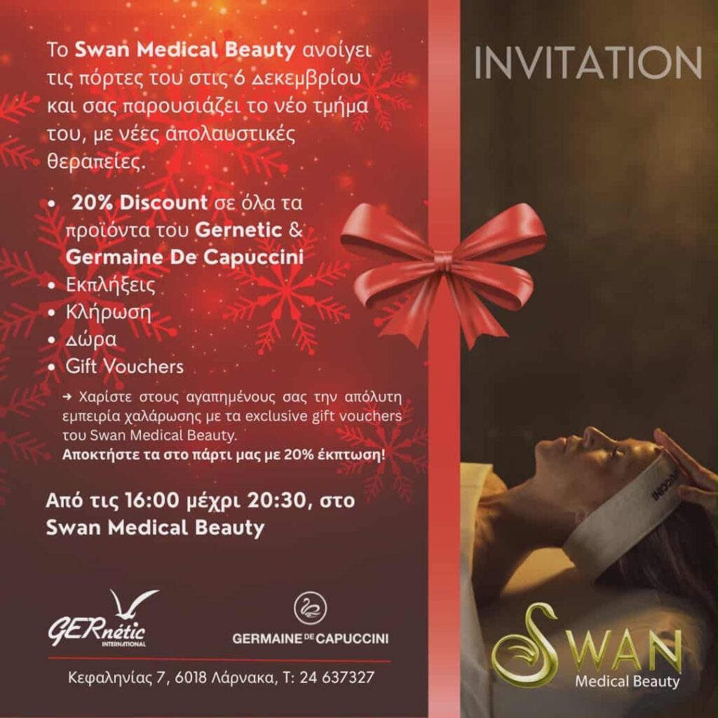 Το Swan Medical Beauty προσκαλεί το κοινό να απολαύσει μια ολοκληρωμένη εμπειρία ευεξίας και να αποκτήσει τα αγαπημένα του προϊόντα και υπηρεσίες με 20% έκπτωση αποκλειστικά για τη μέρα της εκδήλωσης.