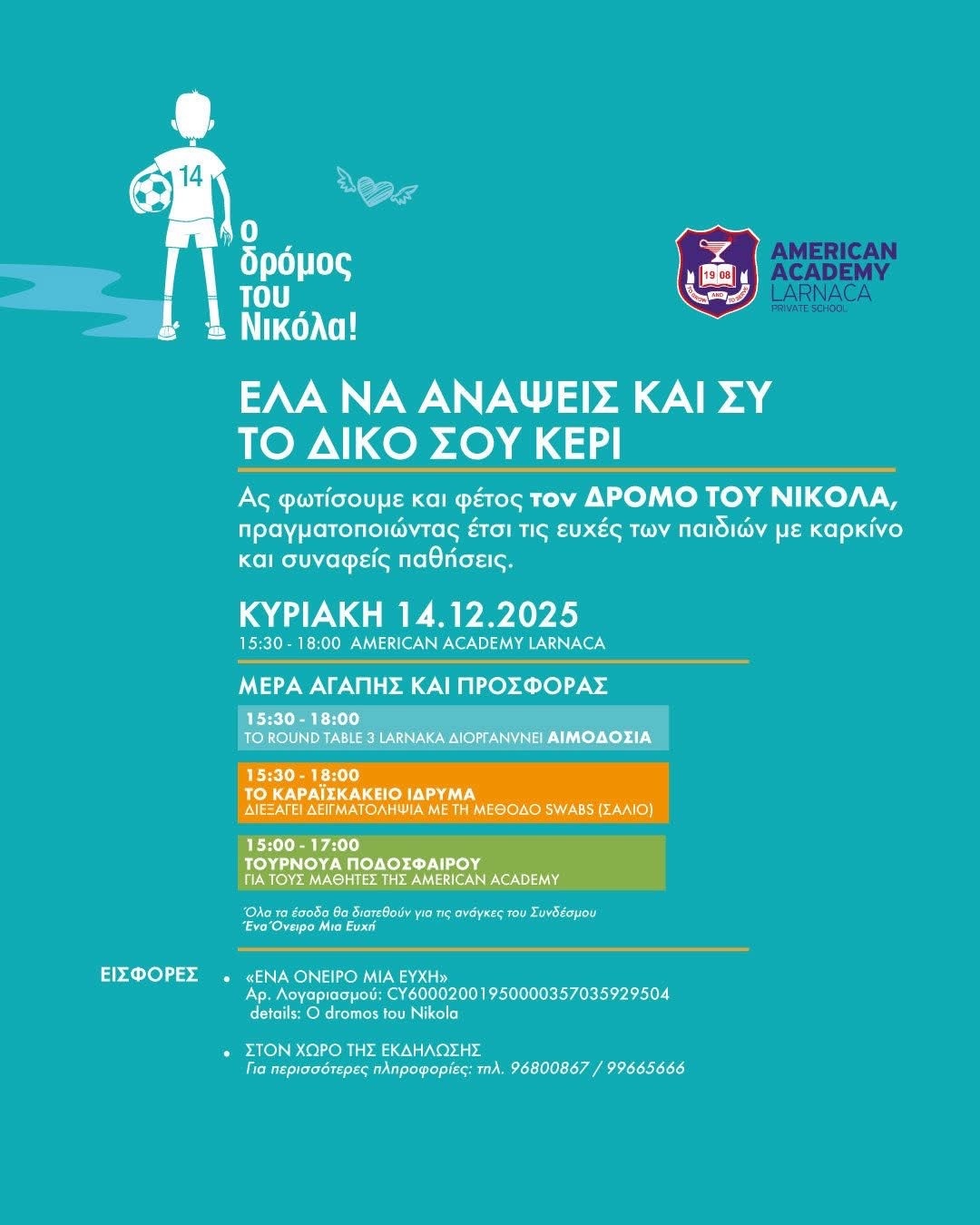“Nikolas’ Path” will once again take place this year, on Sunday 14/12/2025, from 3:30 p.m. to 6:00 p.m., at the American Academy of Larnaca.