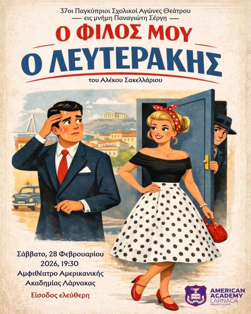 It is with great pleasure that we invite you to the theatrical performance “My Friend Lefterakis” by Alekos Sakellarios, which will be presented by our students as part of the 37th Pancyprian School Theatre Games.