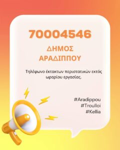 Text follows in English ΑΝΑΚΟΙΝΩΣΗ ΔΗΜΟΥ ΑΡΑΔΙΠΠΟΥ Ο Δήμος Αραδίππου έχει ορίσει προσωπικό επιφυλακής σε περίπτωση έκτακτων περιστατικών εκτός ωραρίου εργασίας