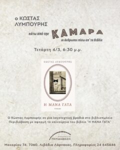 Με αφορμή το νέο του βιβλίο Μάνα γάτα (Ροδακιό, 2025) το βιβλιοπωλείο Περιδιάβαση φιλοξενεί τον Κώστα Λυμπουρή σε μια λογοτεχνική βραδιά