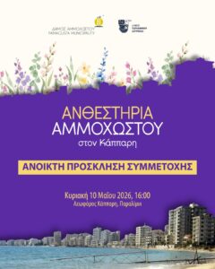 ΠΡΟΣΚΛΗΣΗ ΣΕ ΟΡΓΑΝΩΜΕΝΑ ΣΥΝΟΛΑ ΓΙΑ ΣΥΜΜΕΤΟΧΗ ΣΤΑ ΑΝΘΕΣΤΗΡΙΑ ΑΜΜΟΧΩΣΤΟΥ ΣΤΙΣ 10 ΜΑΪΟΥ 2026 ΣΤΟΝ ΚΑΠΠΑΡΗ Οι Δήμοι Αμμοχώστου και Παραλιμνίου –